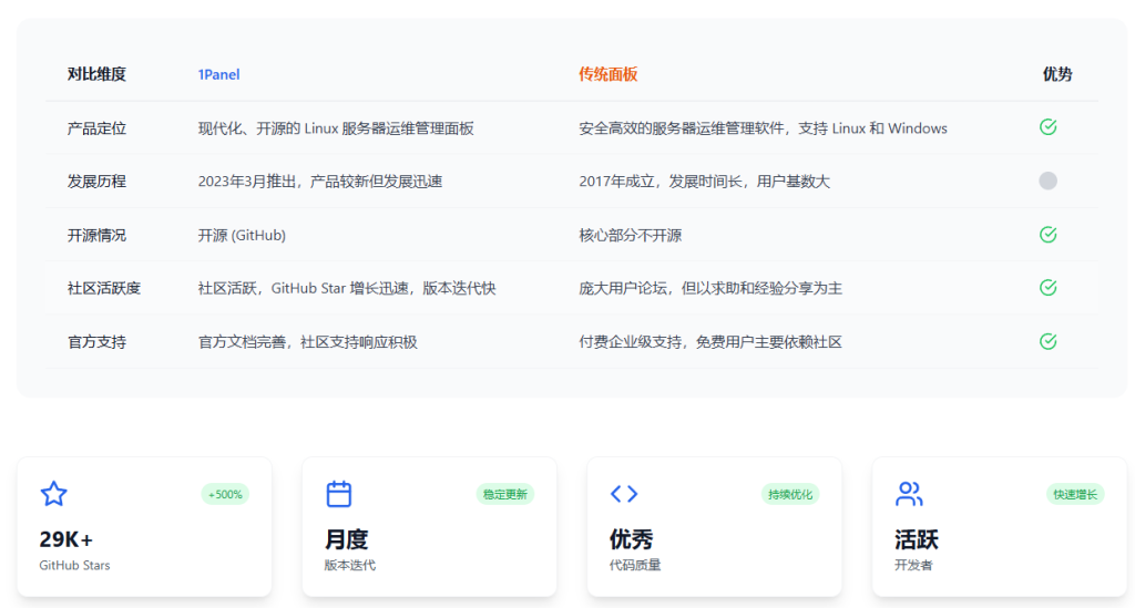 - 全部代码开源在 GitHub(Star 数 29K+),社区可实时审计安全漏洞,相比闭源传统面板减少 “后门” 风险。