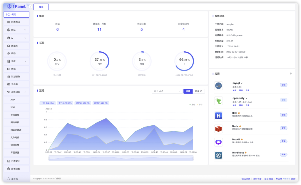 1Panel 能够实时监测服务器的各项关键指标,如 CPU 使用率、内存占用、网络流量以及磁盘读写情况等。这些信息以直观的图表形式呈现,让用户对服务器的运行状态一目了然。通过实时监控,用户可以及时发现服务器性能瓶颈,例如当发现 CPU 使用率过高时,可进一步排查是哪些进程占用资源过多,从而采取相应优化措施,保障服务器稳定高效运行。